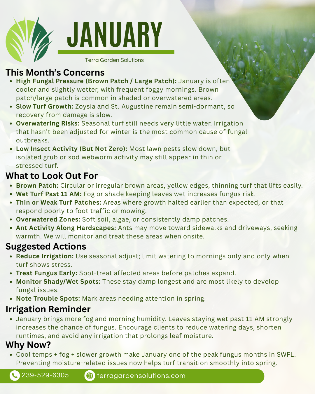 - We have been targeting the dollar weed and the broadleaf weeds. The next property review and treatment for fungus and weeds will be at the end of January.